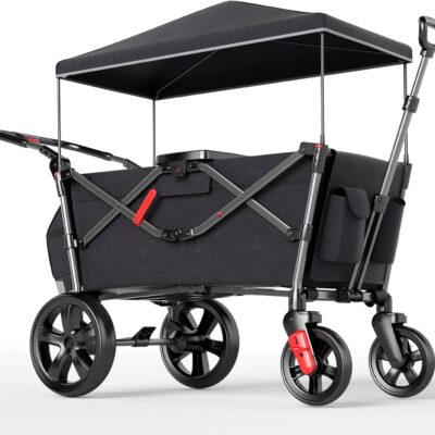 EVER ADVANCED Wagon for Kids to Sit In, Stroller Wagon For 2 Kids with Removable Canopy, Kids Wagon Pull Along with Seats 5-Point Harnesses, Portable Push Pull Cart Wagon with Handle Bar Black