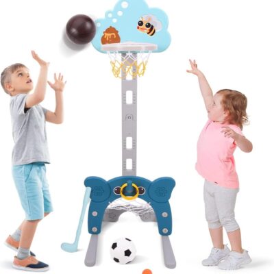 Basketball Hoop Stand Set for Kids 5in1 Sports Activity Center Adjustable Height from 45” to 60” Easy Score Basketball Football Golf Ring Toss Game Indoor Outdoor for Toddlers Boys Girls (bee blue)