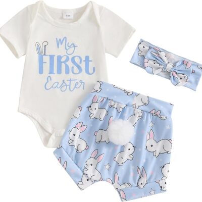 M9ppzzur7 My First Easter Outfit Baby Girls Letter Print Romper and Rabbit Tail Shorts + Headband Set Clothes