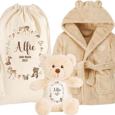 Hoolaroo Personalised Teddy Bear Baby Dressing Gown Gift Set for Newborns, Boys and Girls 1st Birthday Shower Christening Includes Personalised Teddy Bear Robe and Customised Gift Bag
