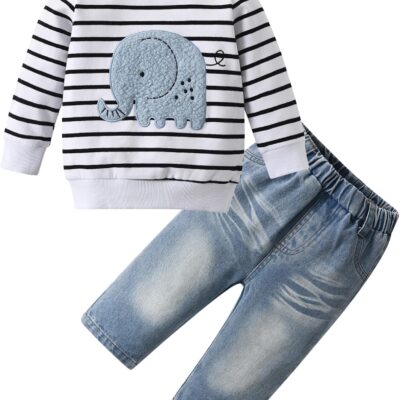 Planooar Baby Boys Elephant Print Stripe Top +Denim trousers Baby Clothes 2pcs Set