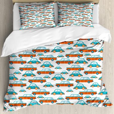 ABAKUHAUS Boys Duvet Cover Set, Nursery Pattern Cars Graphic, Bedding Set 2 Pieces with 1 Pillow Shams, 130 x 200 cm – 70 x 50 cm, Turquoise and Vermilion
