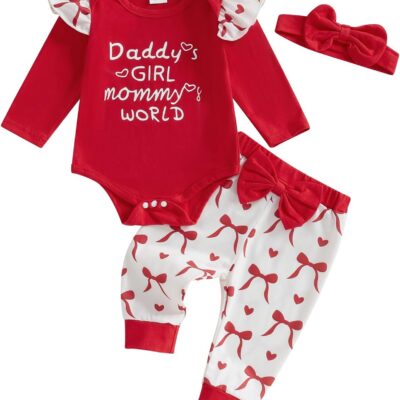 MAHUAOYIXI 3Pcs Newborn Baby Boy Girl Valentine’s Day Outfits Long Sleeve Letter Print Romper Jumpsuit Bodysuit and Bow Print Pants and Headband Clothes Sets for Infant Girls