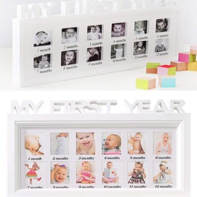 Baby Photo Frame MY FIRST YEAR Birthday Infant Baby Wooden Picture Frame New Born Shower Multi Aperture Hanging Photo Frame with 12 Opening Standing for Baby Birthday Christenings