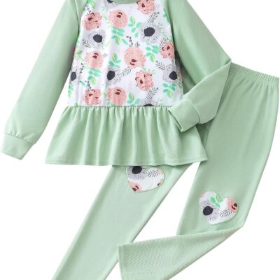 Girl Trousers Set Raglan Long Sleeve Ruffle Top Shirt Print Pants Kid 2 Pcs Outfits Clothes 3-7 Years