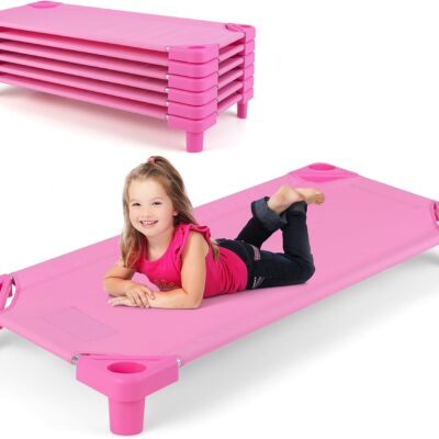 GYMAX Stackable Daycare Cot, Portable Toddler Bed with Easy Lift Corners, Kids Nap Cot for Preschool Classroom (6 Pack Pink Stackable Bed)