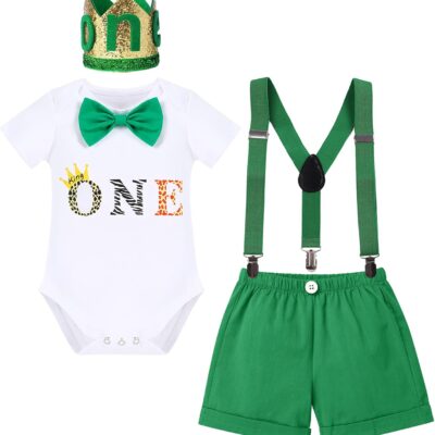 ABEHIK Baby Boy 1st Birthday Party Cake Smash Outfit Safari Jungle Theme Romper+Shorts+Y-back Suspenders+Crown 4 PCS Set Newborn Infant Baby Shower Christening Baptism Clothes Photo Props