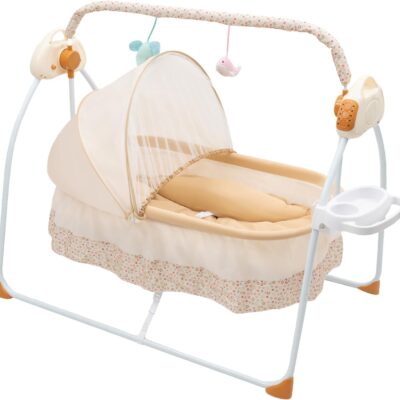 Electric Baby Swing,Portable Baby Swing Chair with Bluetooth Controller and 5 Swing Speed + 4 Types Timer Function,Foldable Baby Bed w/ with Mosquito Net and Awning for 0 Months Plus Newborn (Khaki)