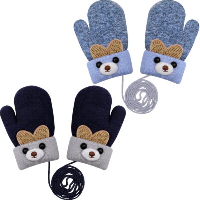 KASURE 2 Pairs Kids Thick Knitted Gloves, Cute Cartoon Hang Neck Mittens, Full Finger Gloves with String, Toddler Baby Winter Warm Mittens for 1-3 Years Old Boys Girls