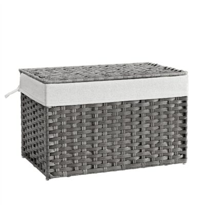 SONGMICS Laundry Basket, 105L Synthetic Rattan Storage Basket with Lid and Handles, Wicker, Foldable, Removable Liners, for Blankets, Clothes, Living Room, Bedroom, Laundry Room, Grey RST066G01