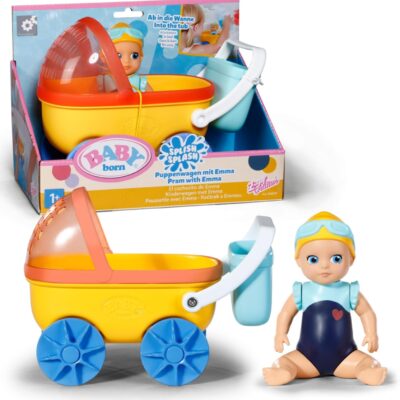 BABY born Splish Splash Pram with Emma, Interactive Toddler Bath Toy with Wind Up Swimming Emma and Pram with Sunshade and Real Working Wheels, Bath Time Toy, 838099 Zapf Creation