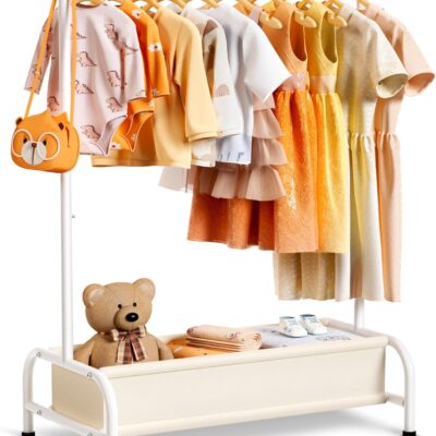MISSLO Kids Clothes Rail with Basket Storage, Children Hanging Dress Up Rail, Baby Clothes Rail Metal, Small Garment Clothing Rack for Girls, Boys & Tollder, White