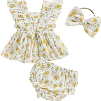 Baby Girl Summer Outfit Strawberry/Cherry/Lemon Smocked Tunic Tops Ruffle Bloomer Shorts Headband Cute 3Pcs Newborn Coming Home Summer Clothes 0-18M