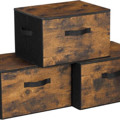 SONGMICS Foldable Storage Organiser Boxes, Set of 3 Storage Basket Bins with Lids, Handles, Clothes Organiser, 40 x 30 x 25 cm, Non-Woven Fabric, Rustic Brown RYZ103B01