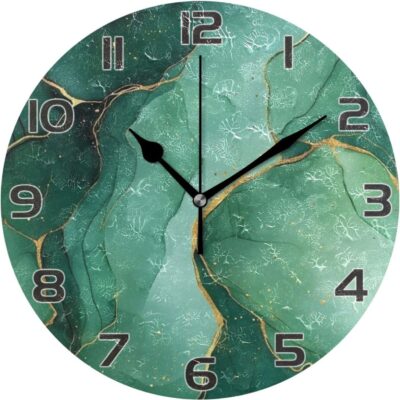 Ewusp Green Gold Marble Wall Clock Battery Operated Silent Non-Ticking Clock Round Quartz Decorative Clock for Kitchen Living Room Bedroom Office School Nursery, 25×25 cm