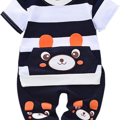 Children’s Clothing Set Clothing Sets for Baby Boys Girls: Striped Print Cotton T-Shirt Top + Little Bear Printed Shorts Long Trousers Bloomers Trousers 2-Piece Clothing Set