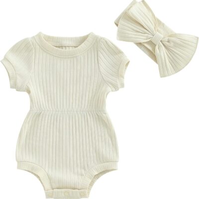 Edhomenn Baby Girls 2 Piece Outfits Solid Color Short Sleeve Romper with Bow Headband Set Newborn Girl Summer Clothes