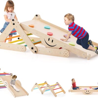 FANTASK Wooden Climbing Equipment, Indoor Climbing Triangle, Multifunctional with Reversible Ramp, Seesaw, Adjustable Climber for Children from 3 Years