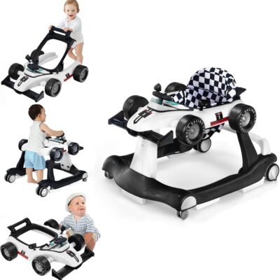 GYMAX Baby Walker, 4 in 1 Foldable Toddler Push Along Walker with Steering Wheel, Music Box, Lights and Comfy Seat, Height & Speed Adjustable Infant Learning to Walk Activity Center (White)