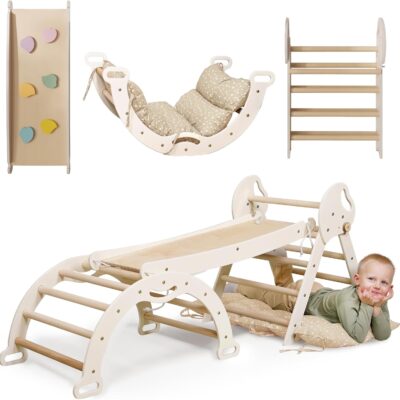 5-in-1 Indoor Climbing Frame for Toddlers -Triangle Ladder, Climbing Arch, Balance and Cushion, Montessori Climbing Frame, Kids Wooden Gym, Foldable Climbing Toys for Kids 1-3 Age