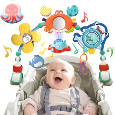 Pram Toys for Babies – Musical Infant Car Seat Toys, Baby Crib Toys with Music Box, Foldable Pushchair Toys Stroller Hanging Montessori Sensory Toys for Boys Girls Newborn Shower Gifts