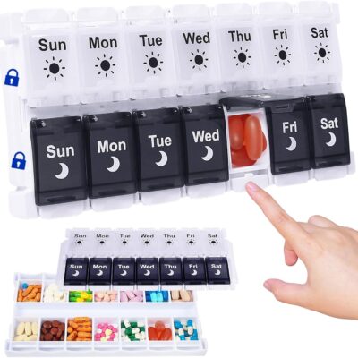 Pill Boxes 7 Day 2 Times a Day, Easy Fill Push Button Weekly Pill Box Medicine Organiser Large Am Pm Tablet Organiser for Vitamin, Fish Oil, Supplements
