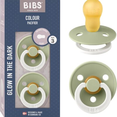 BIBS Colour Night Glow in The Dark Soother 2-Pack, BPA Free Dummy Pacifier, Round Nipple. Natural Rubber Latex, Made in Denmark, Size 3 (18+ Months), Sage Glow