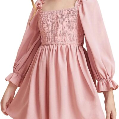 JiAmy Girls Dress Long Sleeve Square Neck Dresses Spring Summer Kids Casual Elegant Wedding Party A-Line Skirt Clothes for Girl 4-14 Years