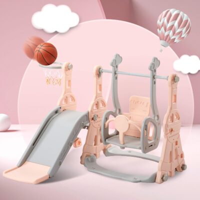 Slide Set for Children 4-in-1 Kids’ Playset Toddler Climber and Swing Set Playground Play Set with Removable Basketball Hoop,Long Slide and Ball,Climb Stairs,Indoors & Outdoor Safe Play Equipment Pink