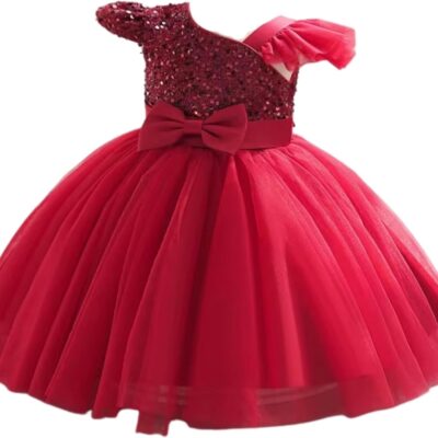 miço kids Baby Girls Sequin One-Shoulder Princess Dress | Burgundy Tulle Party Gown | Flower Girl, Birthday, Wedding & Dress
