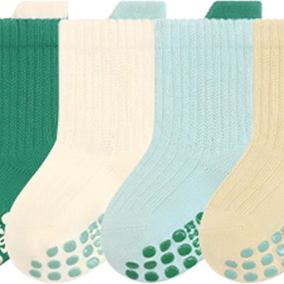 Dioshark Baby Non Slip Socks 4 Pairs Boys Girls Crew Grip Socks Kids Cotton Warm Thermal Anti Slip Socks Toddler Winter Aumtun Spring Multicolor Socks Set for Infant Newborn Children Age 0-5 Years