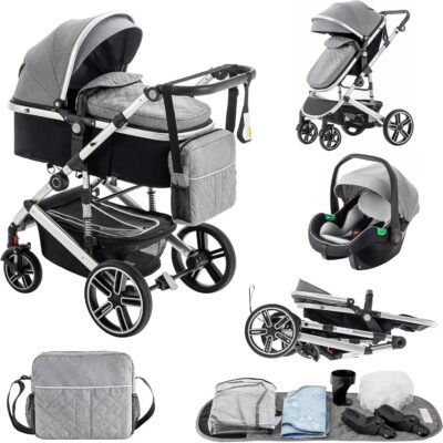 Lnhcrbs Baby Stroller 3 in 1 with Car Seat, Travel Stroller Frame is Aluminium,with Sleeping Basket Clips, Baby Stroller is Foldable, Rain Cover, Mosquito Net, Suitable for 0-48 Months,22Kg,Grey