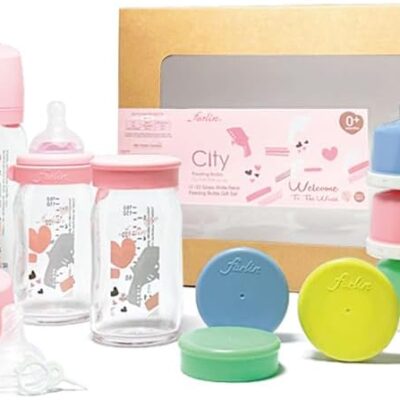 FARLIN Anti-Colic Glass Baby Bottles with Silicone Pacifier and Milk Powder Container, Thermal Resistant, BPA Free, for 1 Month+ Babies – (Fly, 5oz*2 + 8oz*2)