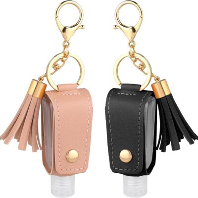2 Pcs Small Hand Sanitizer Keychain Portable Leather Hand Sanitizer Holder Leakproof Plastic Empty Bottles Hand Sanitizer Travel Holder Bottle for Lotion Liquid Soap Shampoo Black Pink