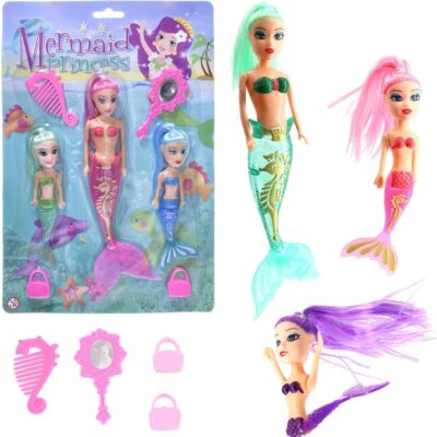 7 Piece Bath Time Toy Set – 3 Mermaid Princess Dolls with Bright Long Hair and Hair Brush & Mirror Accessories, Boys and Girls Ocean Themed Waterproof Toys, Ideal for Bath, Pool Pretend Fun Play
