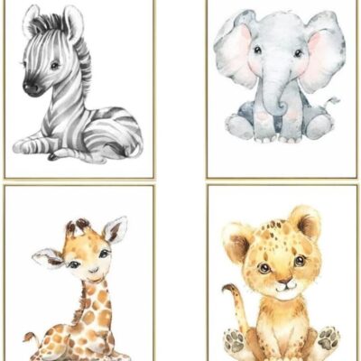 4 Pack Baby Jungle Nursery Wall Decor Art Pictures 30 x 21cm Safari Animal Wall Murals for Baby Kids Living Room Bedroom Bathroom Without Frame