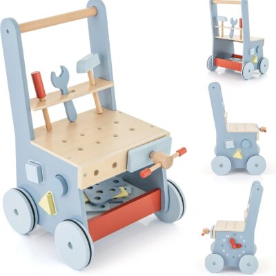 GYMAX Wooden Baby Walker, 2-in-1 Toddler First Step Activity Interactive Push Along Toy with Smooth Handle, Wheels, Back Storage, Sit-to-Stand Learning Walker for Girls & Boys