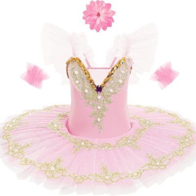 Odizli Ballerina Costume for Girls Flutter Sleeve Lace Pearl Embroidered Tulle Tutu Ballet Dress + Hair Clip + Armbands