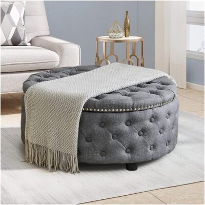 INMOZATA Chesterfield Footstool Linen Large Footstool Buttoned Footstool Coffee Table Round Footstool Coffee Table for Living Room Bedroom Dark Grey