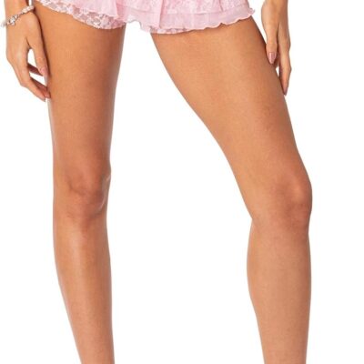 LYSINK Y2K Women’s Mini Lace Shorts – Sexy Ruffle Layered Elastic Waist Bow Front Bloomer Shorts in Solid Color