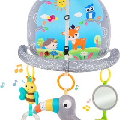 Car Seat Toy, Car Travel Activity Centre, Car Seat Toys 0-6 months with Mirror/Arch Pram Toys/Crinkle Mat to Play and Kick, Adjustable Sensory Car Toys for Babies