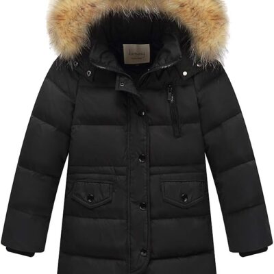 amropi Kids Girls Winter Puffer Jacket Padded Long Coat with Fur Hood for 2-12 Years
