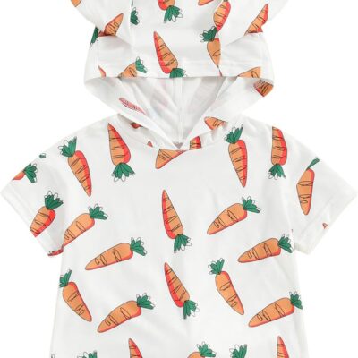 Loalirando Infant Baby Boy Girl Easter Romper Carrot Print Rabbit Ears Hooded Jumpsuit Short Sleeve Sweatshirt Bunny T-Shirt Bodysuit