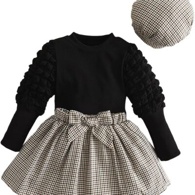 HEOXIN Toddler Baby Girls Plaid Mini Skirt, Plaid Dress + Tops + Matching Tartan at 3PCS Set, A Line Princess Dress with Cute Bowknot, Puff Sleeve Tops and Hat for 2-7 Years, Black