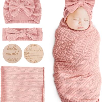 DRESHOW Newborn Baby Blanket Soft Swaddle Blankets for Infant Swaddling Receiving Warm Wraps with Bow Hat Headband