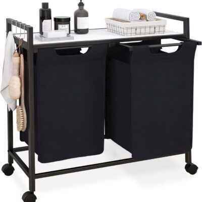 STELLSTAR Laundry Hamper with Wheels, Large 2×50L Laundry Basket with 2 Pull-Out and Removable Bags, Bathroom Laundry Sorter Cart with Metal Frame, Bamboo Top and 4 Hooks for Clothes, White and Black