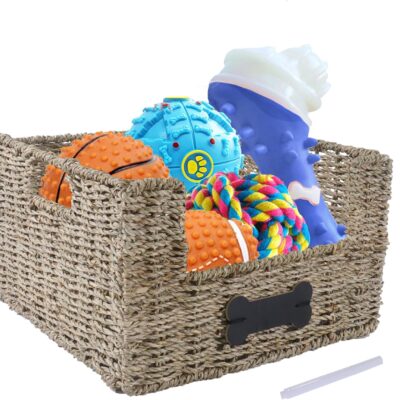 Ctomche Dog Toy Storage Basket with Handles,Collapsible Pet Toy Organiser,Wicker Dog and Cat Toy Stuff Storage Basket,Handwoven Storage Box Chest Organizer for Dog Toys treats,Leashes, Blankets