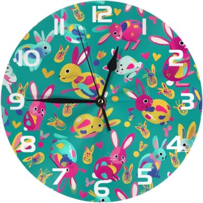 Mexpekil Colorful Rabbits Cute White Silent Wall Clock Non Ticking 25cm Round Wall Clocks Battery Operated Modern Decorative Clock for Living Room
