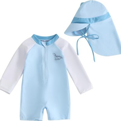 Geagodelia Baby Boy Swimming Costume Infant Boys One Piece Swimsuit Long Sleeve Contrast Color Dinosaur Bathing Suit Summer Rash Guard Sun Hat