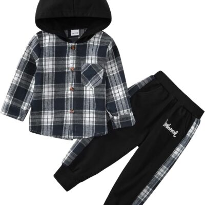 Naiyafly Toddler Boys Clothes Set Kids Long Sleeve Hoodie Plaid Sweatshirt Tops + Pants Outfit Set Children Hooded Button Down Shirts Bottom Tracksuit Boys School Playsuit